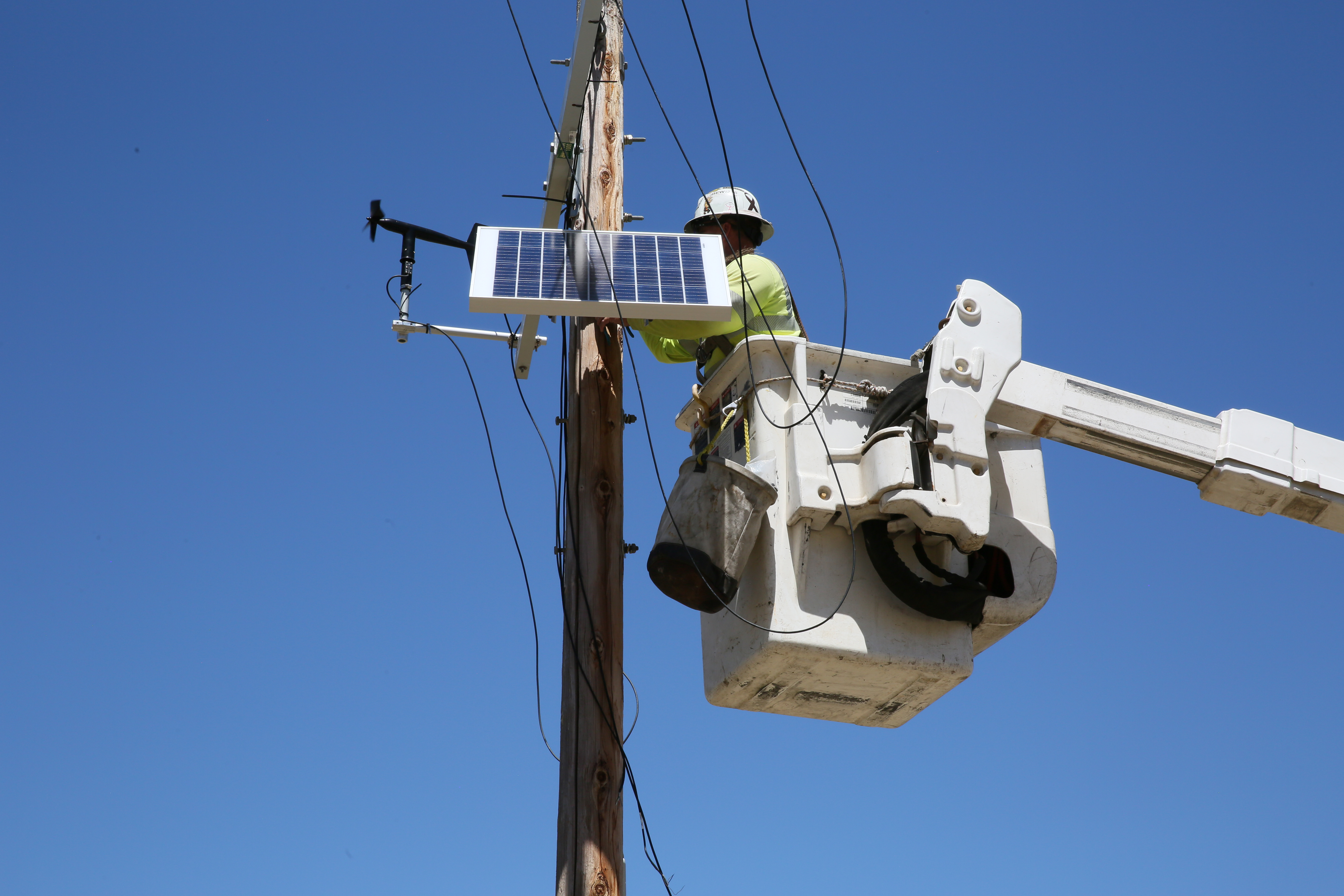A lineman engages Enhanced Safety Settings on electrical equipment during wildfire season.